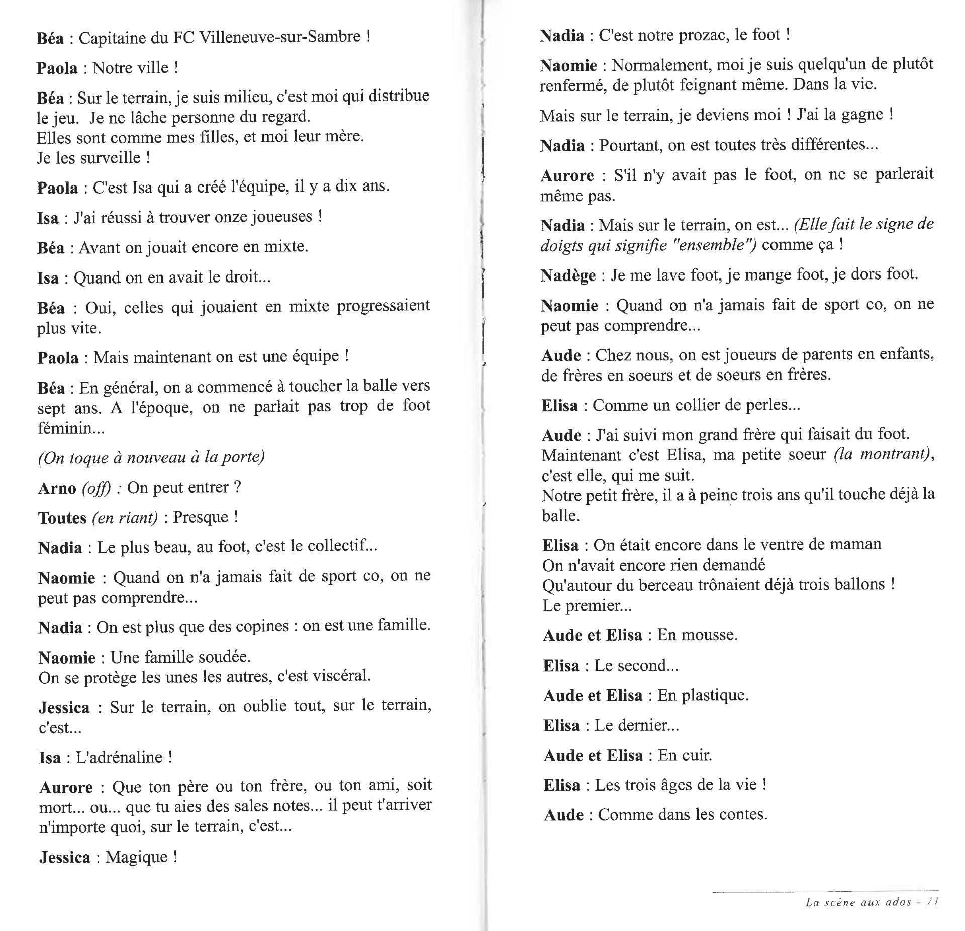 - La grande et belle aventure du foot féminin. Une équipe soudée. Des histoires de vestiaire. Des histoires de match. Des histoires d'altercations entre joueuses. Des histoires d'arbitrage. Des histoires d'amour. Et les victoires qui consolent de bien des choses de la vie. Une super pièce pour une troupe de filles !!