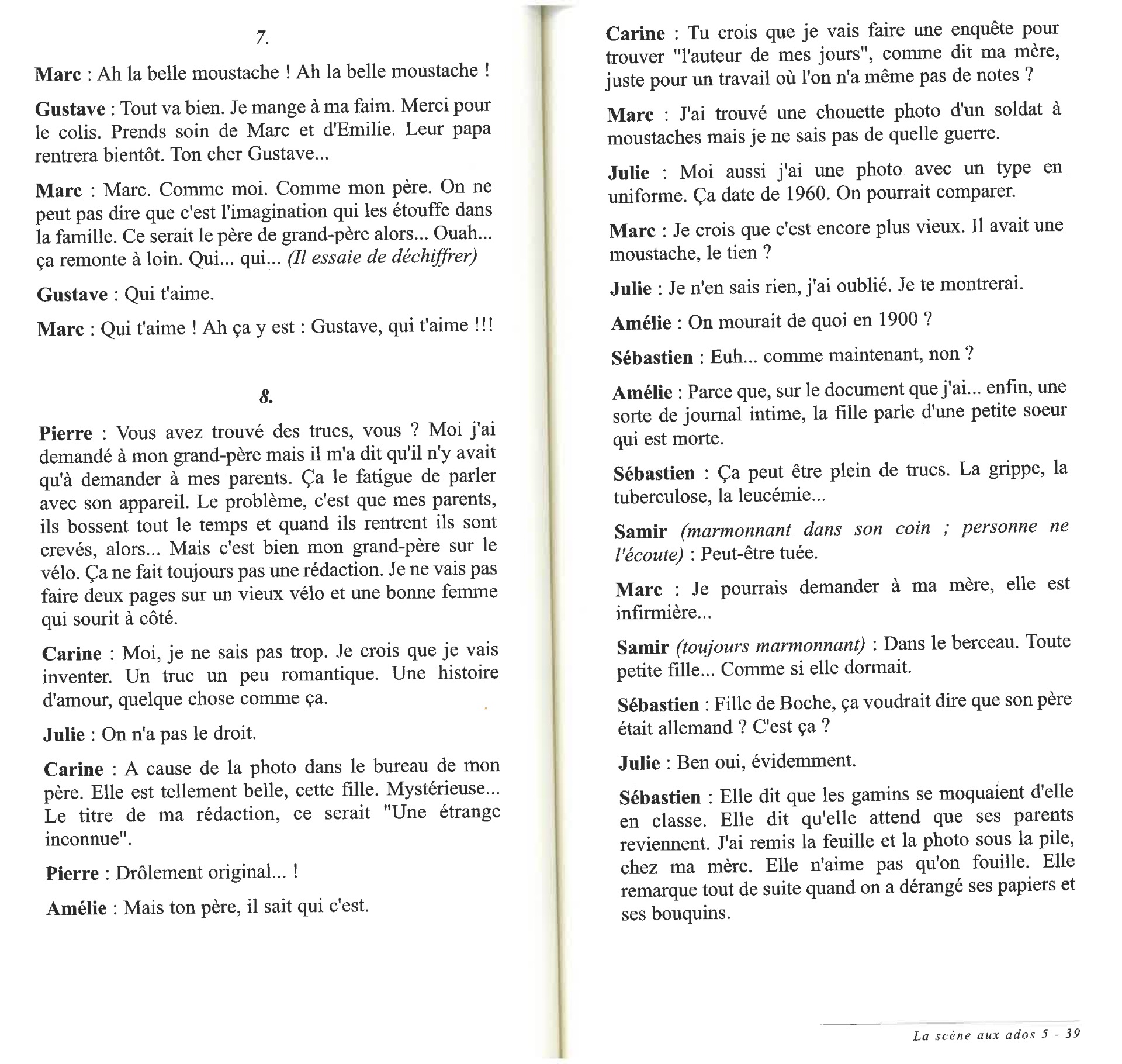 - Très beau texte écrit par petits blocs numérotés, interchangeables, laissant beaucoup de liberté de « montage ». Confrontation de plusieurs époques où les protagonistes se parlent à travers les âges. Intergénérationnel.